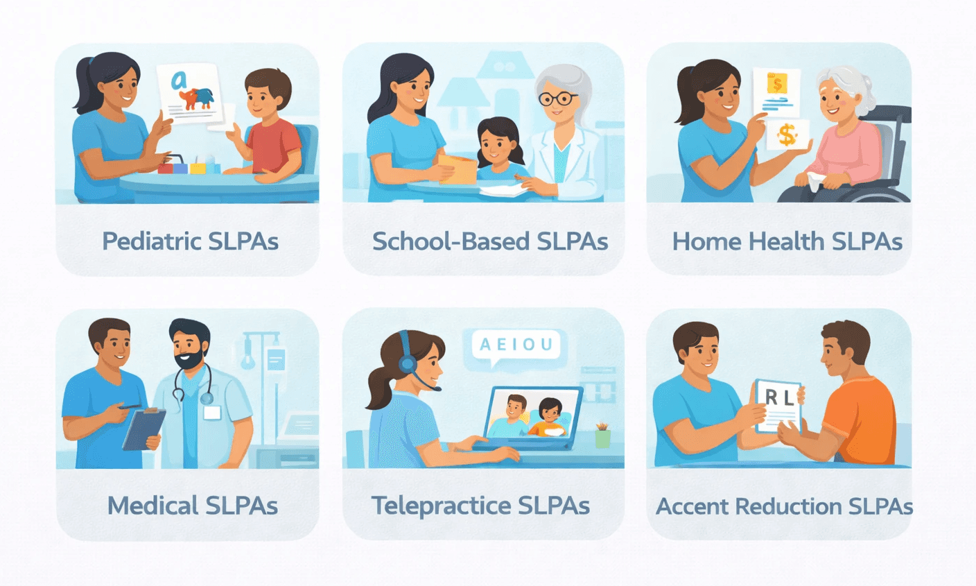 SLPAs seeking flexible second caseloads, Retired or semi-retired clinicians who want part-time consulting or teletherapy, SLPAs transitioning from medical to school settings (we help with the onboarding process)